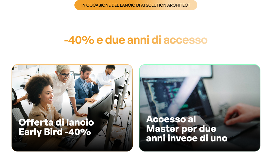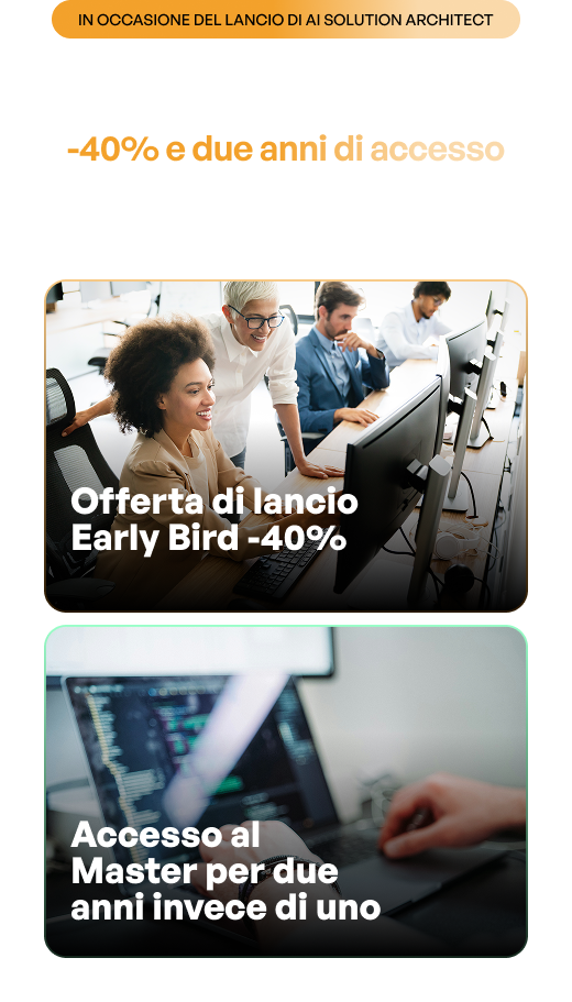 No, tutt’altro! L’intelligenza artificiale non sostituirà l’AI Solutions Architect, ma ne favorirà l’evoluzione verso competenze sempre più strategiche e specialistiche, che vanno oltre la semplice gestione di modelli o strumenti. Negli anni, la tecnologia ha reso sempre più efficienti gli strumenti per sviluppare applicazioni e sistemi complessi. Il prossimo passo è integrare l’AI nei processi decisionali e nelle architetture aziendali, ma resterà sempre compito dell’AI Solutions Architect progettare, orchestrare e ottimizzare soluzioni AI end-to-end, con l’AI come alleata preziosa. Il nostro master è progettato proprio per fornirti le competenze e gli strumenti necessari per eccellere in un mondo in cui l’AI è parte integrante della progettazione e della strategia.